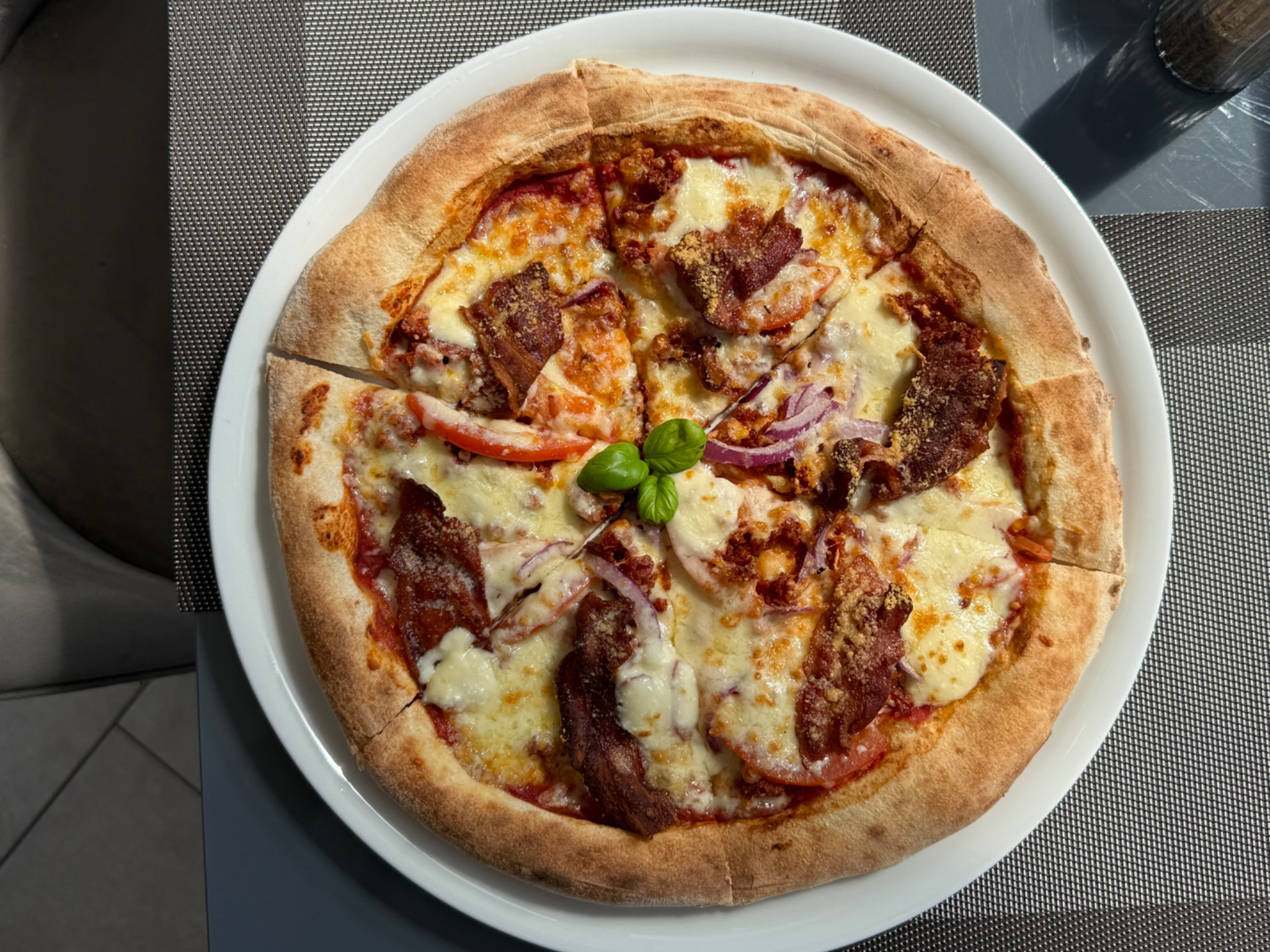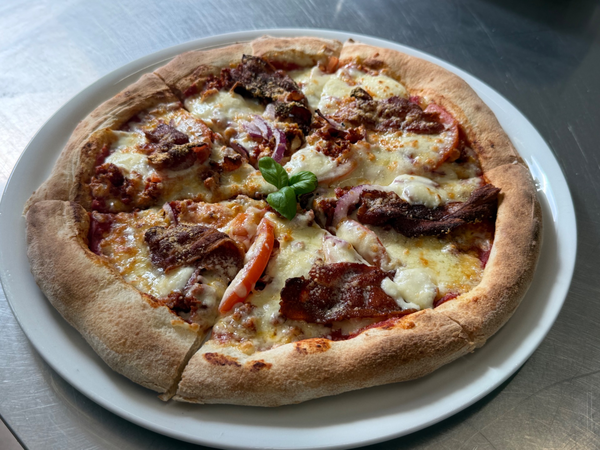 Tejfölös alap, kolbászmorzsa, bacon, paradicsom, lilahagyma, juhtúró, pecorino sajt, reszelt mozzarella sajt.