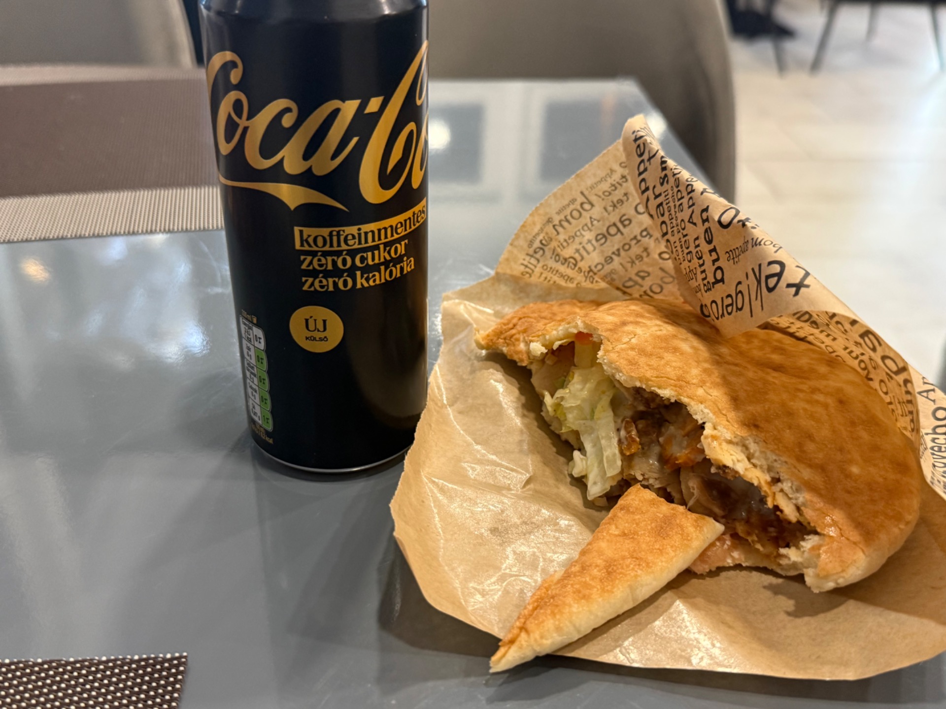 Pita, csirke gyroshús, lilahagyma, paradicsom, kígyóuborka, megjegyzésben fokhagymás, kapros, tzatziki, ezersziget, csípős öntet…