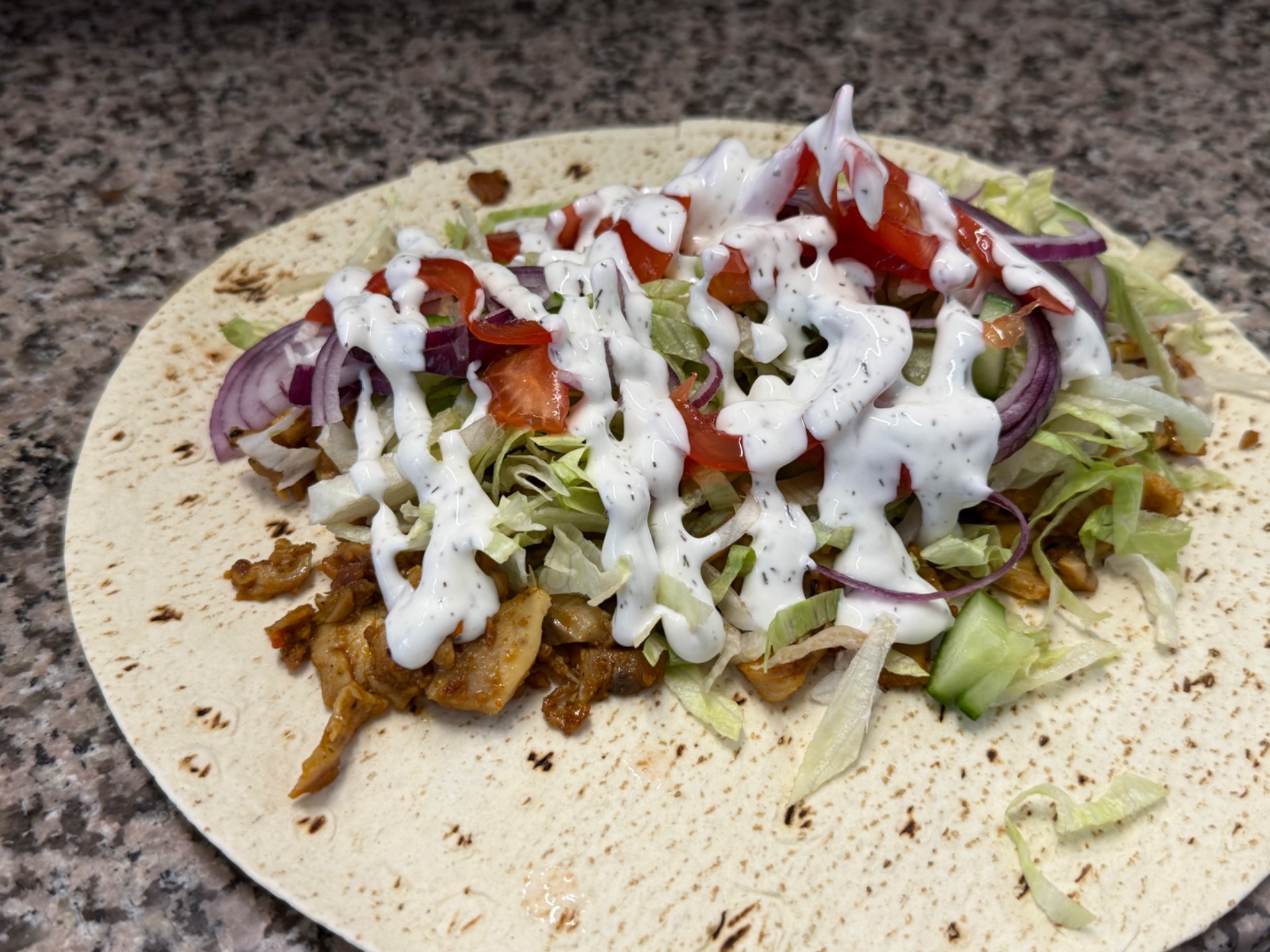 Gyroshús, jégsaláta, lilahagyma, kígyóuborka, paradicsom, fokhagymás, kapros, ezersziget vagy tzatziki öntet.